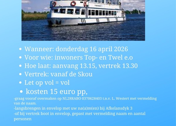 Nei it sukses yn 2024 wurdt der op ’e nij in gesellig boatereiske organisearre foar de 60 plussers út Top en Twel ús omkriten. Op tongersdei 16 april 2026 geane de trossen wer...