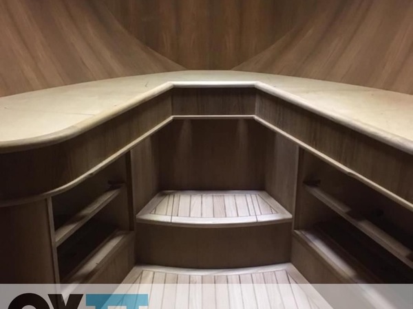 Er wordt druk gewerkt aan het interieur van een 12m motorboot in aanbouw. Het interieur wordt gemaakt van Bamboehout. Het is de eerste keer dat er met dit materiaal gewerkt wordt, de klant heeft het uitgezocht. Dit interieur voor deze one-off wordt volledig naar de wensen van de klant gemaakt. Dit gaat allemaal in overleg en zonder werktekeningen.