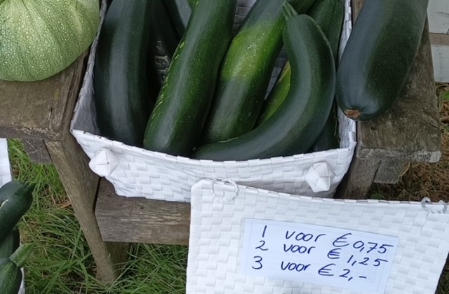 Het winkeltje staat weer vol met leuke dingetjes en lekkernijen, waaronder de zelfgemaakte drievruchtenjam, aardbeienjam en natuurlijk de net geoogste courgettes! "Dus hebben we binnenkort de courgettesoep ook weer in de koelkast".