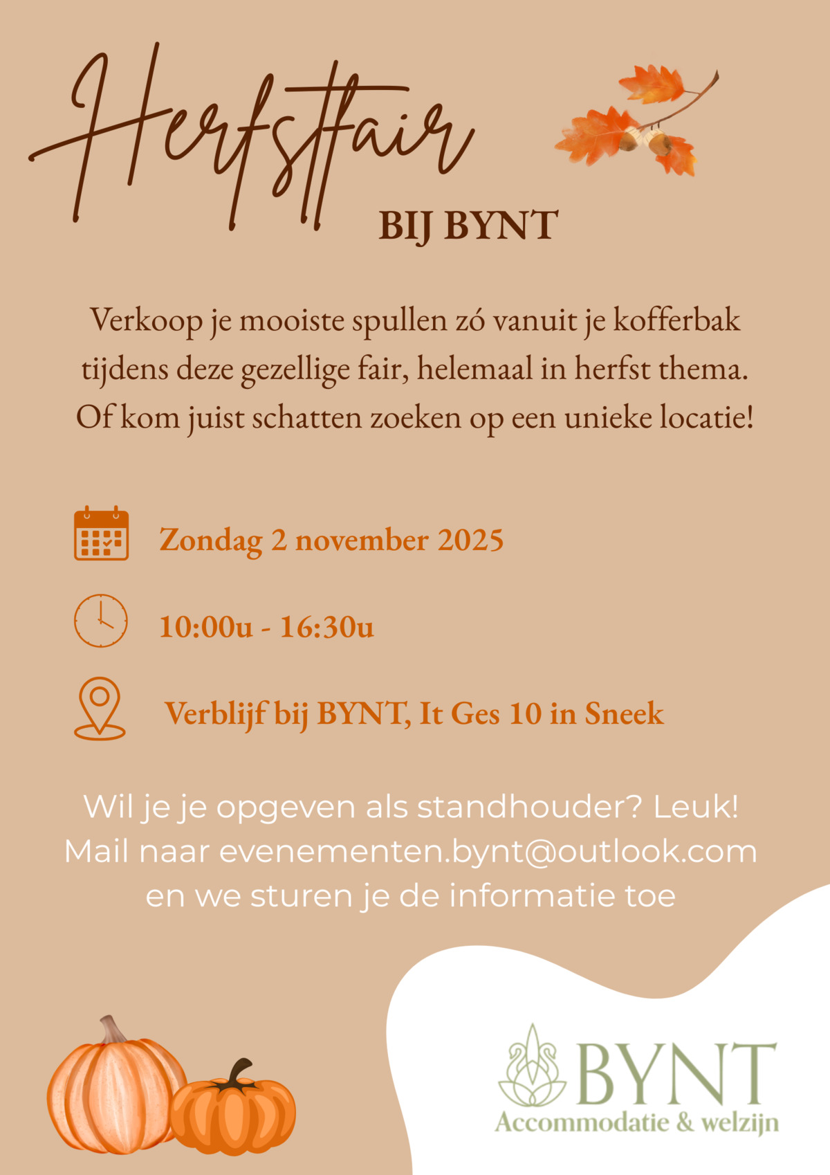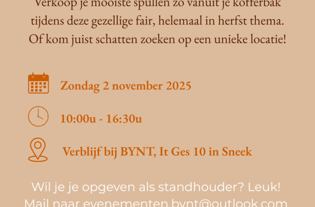 Wie zelf wil deelnemen met een kraampje of vanuit de kofferbak wil verkopen, kan zich aanmelden door een e-mail te sturen naar: evenementen.bynt@outlook.com.