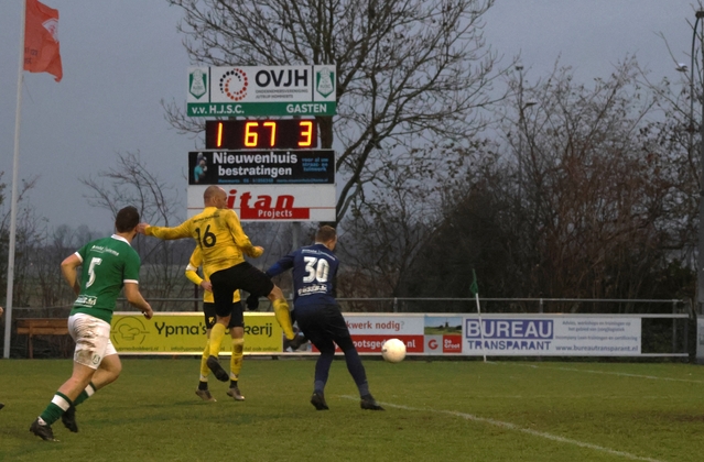 Op slag van rust werd het allemaal nog veel mooier voor TOP'63. Vanaf links brak Douwe de Jager door, die de vrijstaande Leon van Dijk vond. De binnentikker zorgde voor een comfortabele 1-3 ruststand voor de geelhemden.
