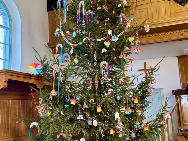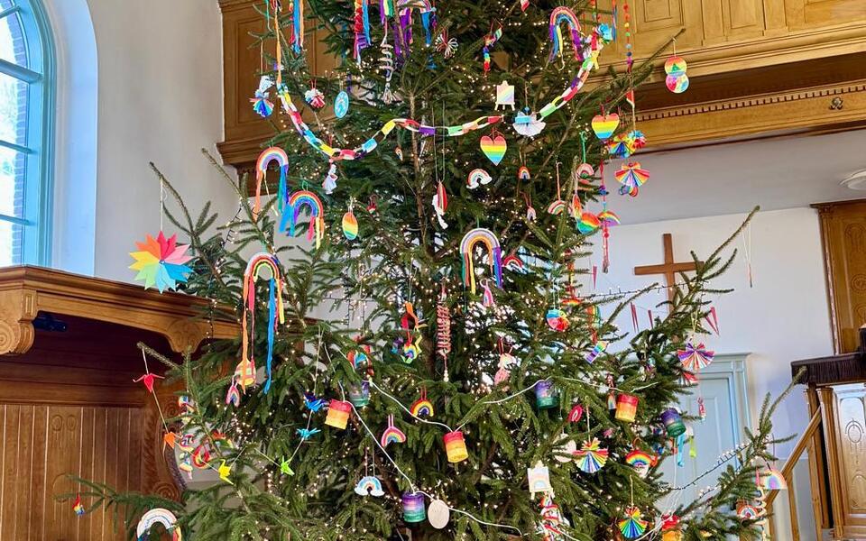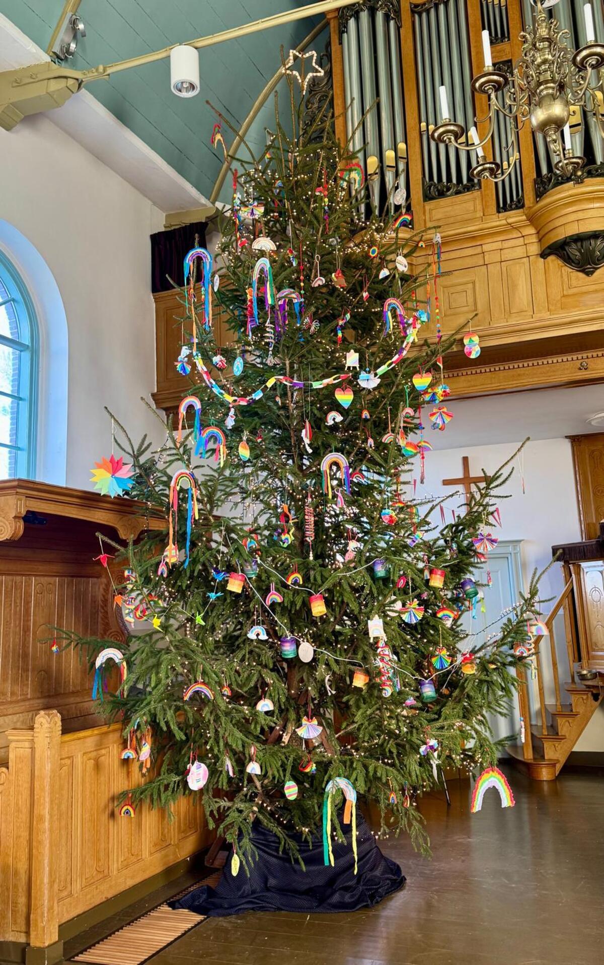 Met de ‘Regenbogen van hoop’ wil de kerkelijke gemeente laten zien hoe belangrijk verbinding en vertrouwen is, juist in deze tijd. De regenboog, wereldwijd een symbool van hoop, heeft daarom een prominente plek gekregen in de kerstversiering van de kerk.