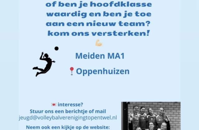 Wie interesse heeft of iemand kent die goed zou passen, kan contact opnemen voor meer informatie via een berichtje of per mail: jeugd@volleybalverenigingtopentwel.nl.