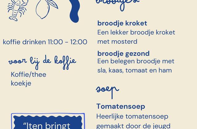 De lunch begon na de kerkdienst, iets na 11.00 uur. De gasten werden ontvangen met koffie, waarna voor iedereen de lunch werd geserveerd. Op het menu stond huisgemaakte tomatensoep, bereid door de jongeren uit Top en Twel. Daarna volgden belegde broodjes: een broodje kroket met mosterd en een broodje gezond met sla, kaas, tomaat en ham.