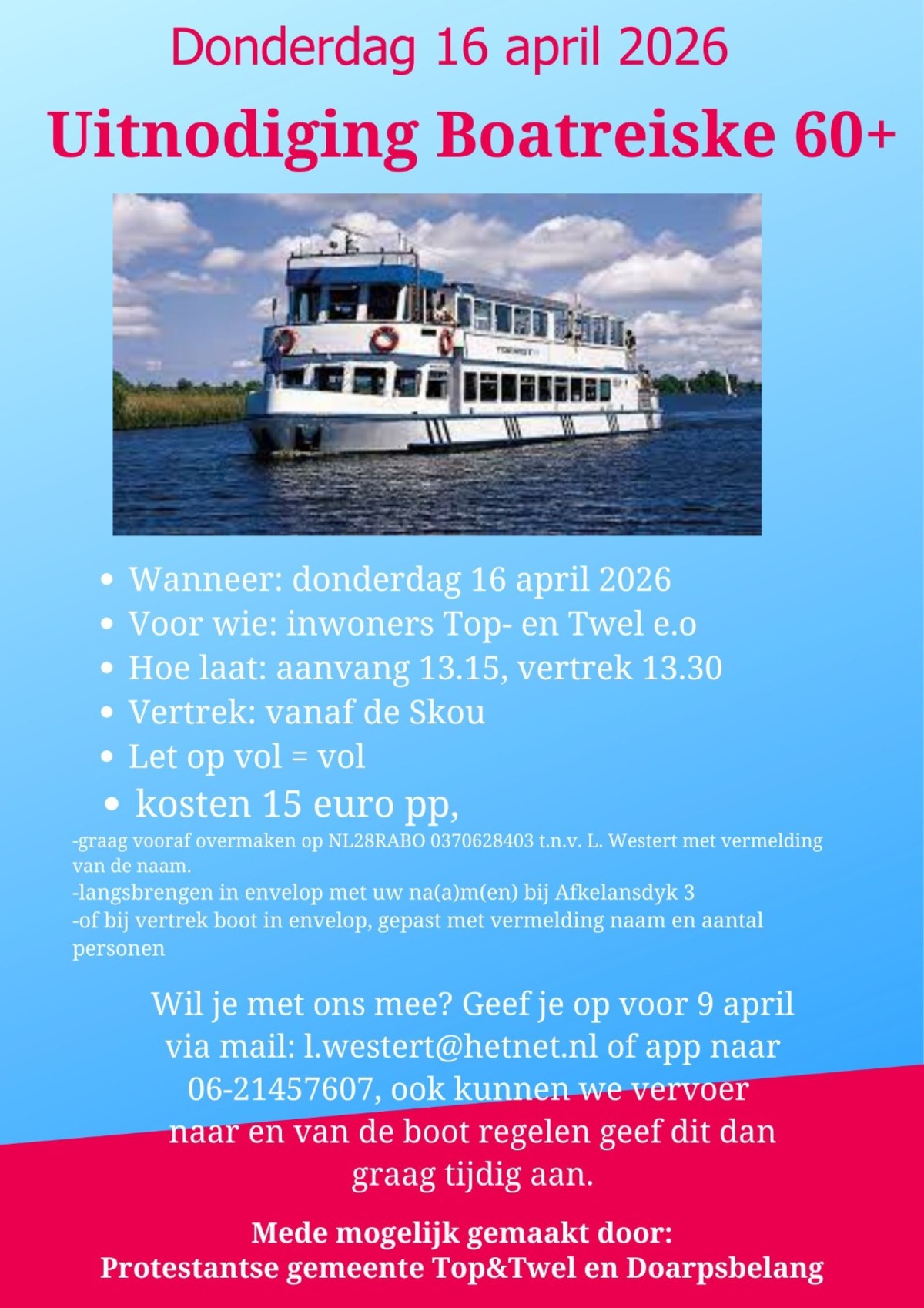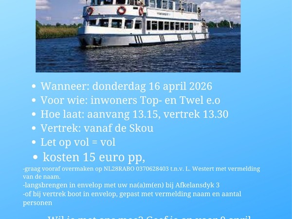 Nei de ûntfangst fanôf om 13.15 oere by De Skou, fart de boat om 13.30 oere ôf. De kosten binne 15 euro de persoan. Oanmelde kin oant en mei 9 april. Stjoer in berjocht nei l.westert@hetnet.nl of nei 06-21457607. Betelje kin foarôf op NL28 RABO 0370628403 op namme fan L. Westert (ûnder fermelding fan namme) of kontant yn in slúf mei namme en tal persoanen. By fertrek graach gepast betelje.