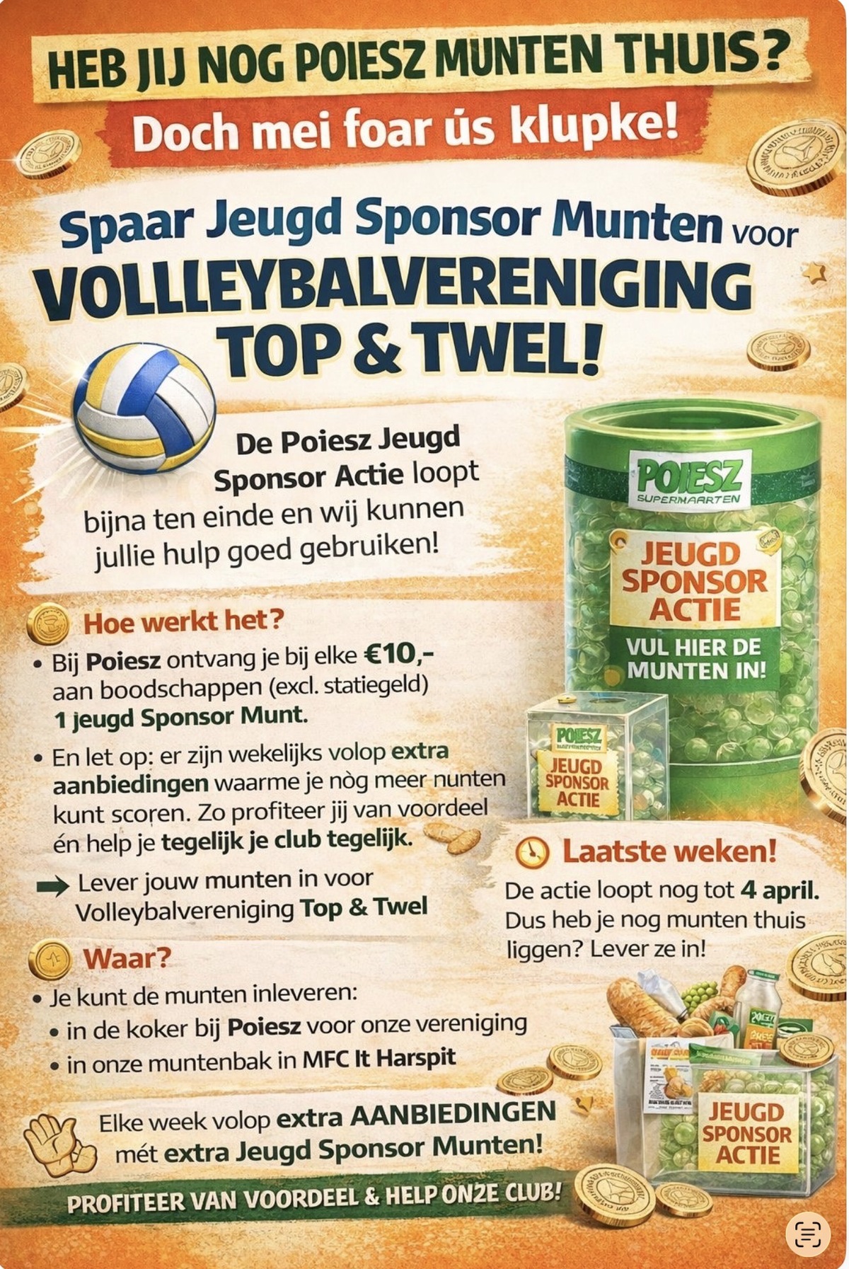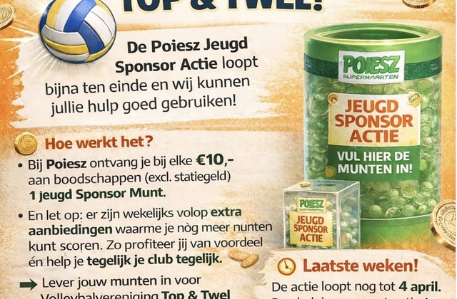 Volleybalvereniging Top & Twel doet dit jaar mee aan de Poiesz Jeugd Sponsor Actie. Met deze actie kunnen klanten van supermarkt Poiesz sponsormunten sparen voor hun favoriete vereniging. De volleybalvereniging hoopt in de laatste weken van de actie nog veel munten te verzamelen om de jeugdactiviteiten van de vereniging te ondersteunen.