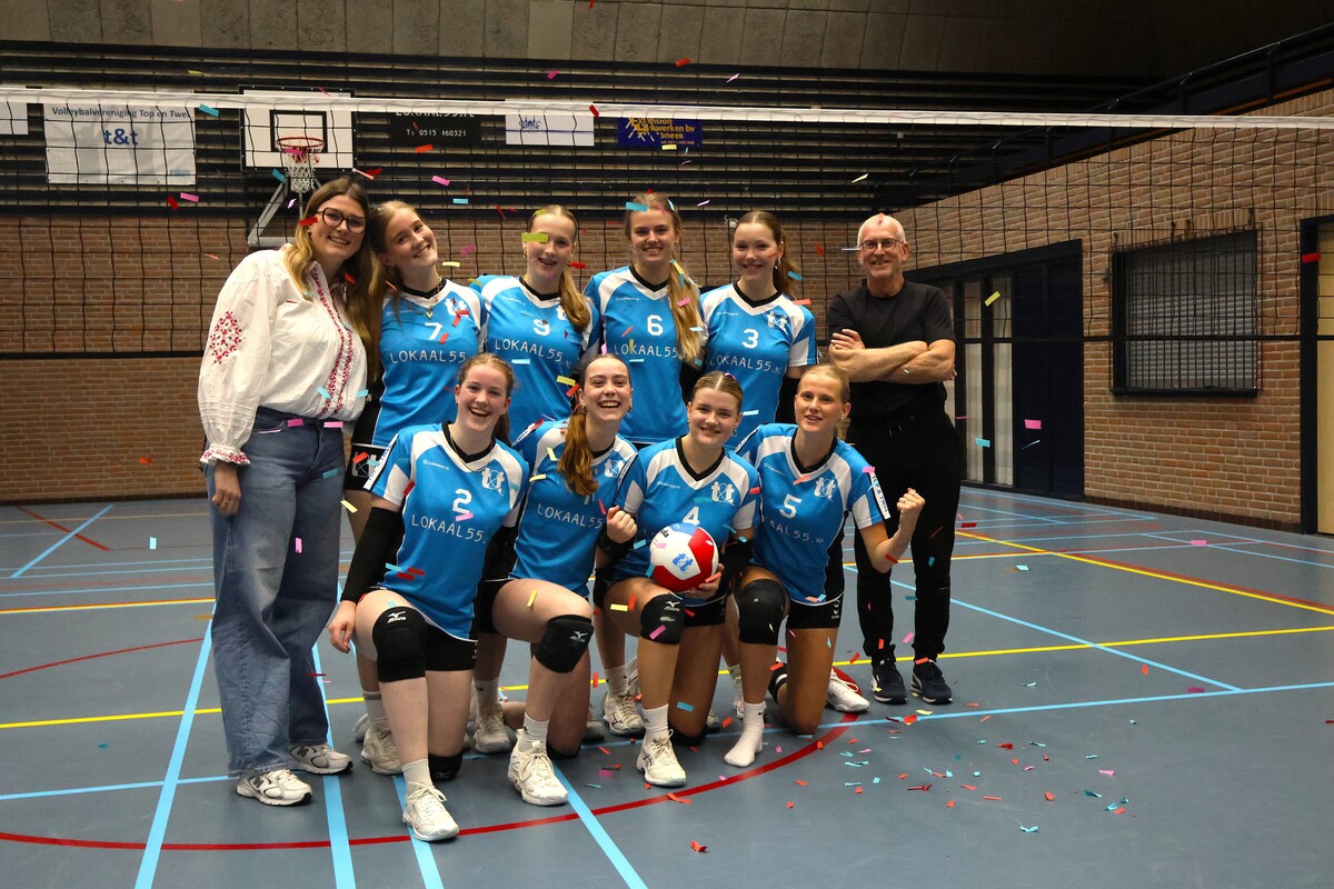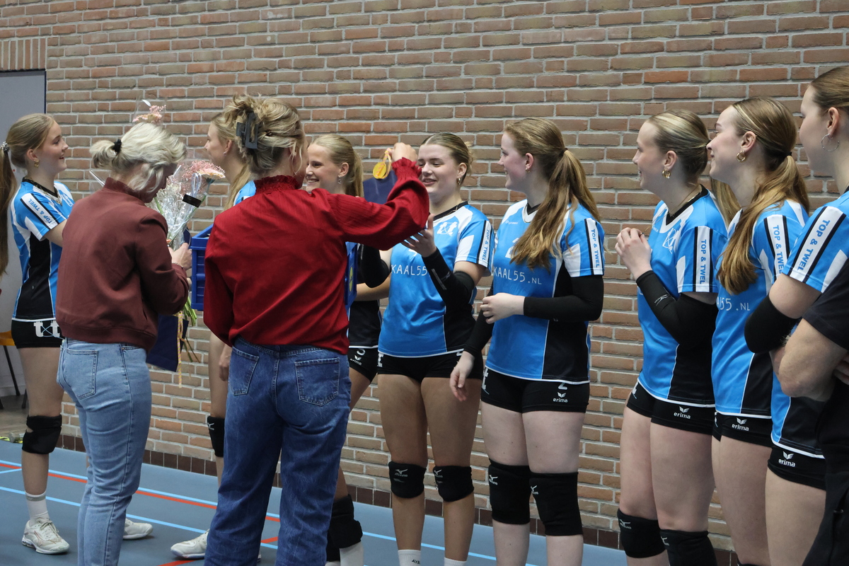 Afgelopen zaterdag presteerden de meiden vrijwel het onmogelijke. Ze moesten met 4-0 winnen van concurrent Impala om kampioen te worden. In een ware thriller wisten ze deze lastige taak te volbrengen. Toen begon het rekenen, want de setstanden en de wedstrijdpunten in deze competitie zorgden voor een bijzondere situatie. Ondanks dat het aantal punten gelijk was, bleek het aantal gewonnen en verloren sets (32-9) en de wedstrijdpunten nagenoeg identiek te zijn. Uiteindelijk werd er bij de NEVOBO een rekenmodule gebruikt die uitwees dat het verschil tussen beide teams slechts een duizendste was, te klein om het kampioenschap van Top & Twel af te nemen.