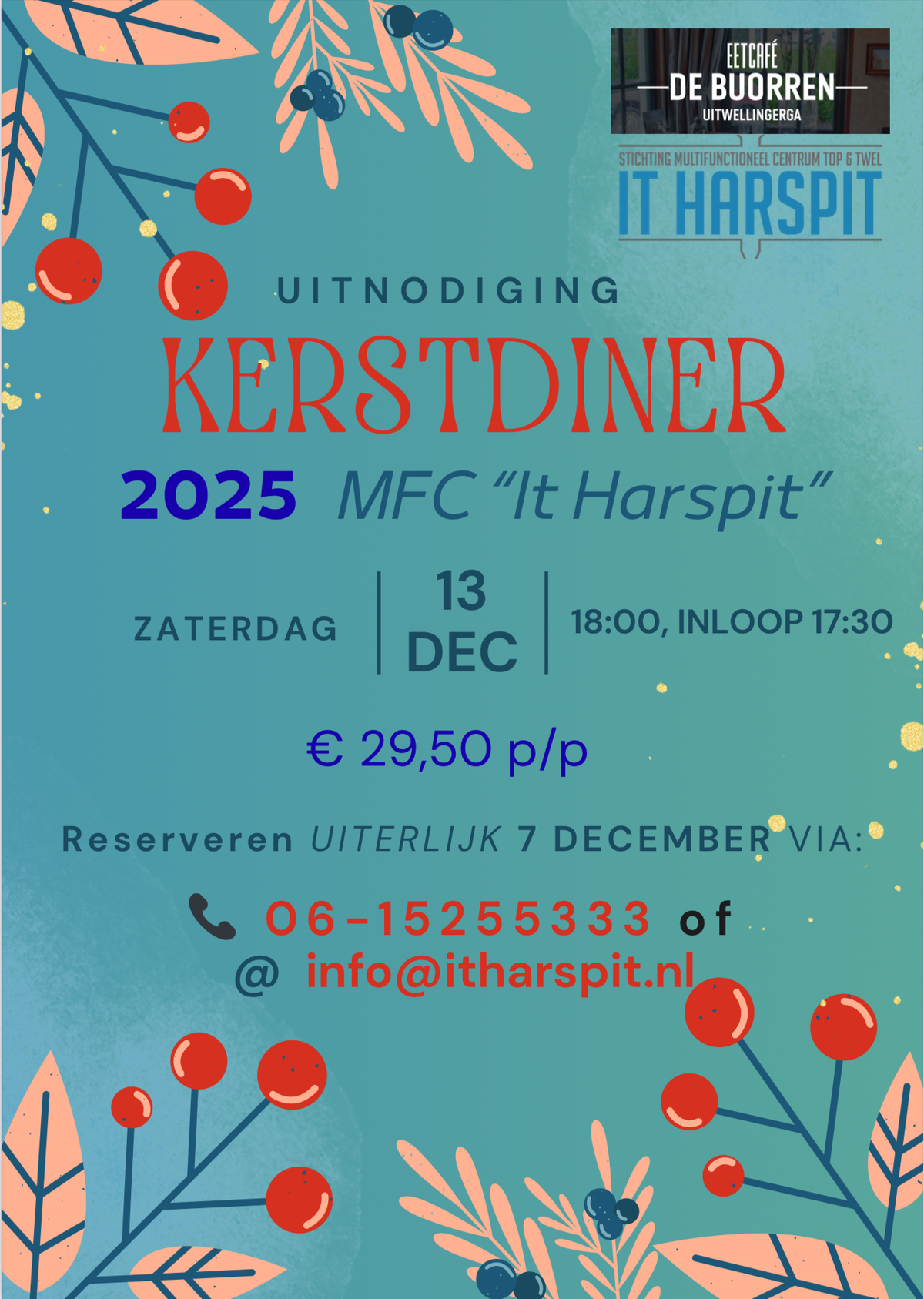 Het gezellige Kerstdiner is weer aanstaande. Op zaterdag 13 december kun je weer aanschuiven voor het driegangenmenu, verzorgd door Eetcafe De Buorren.