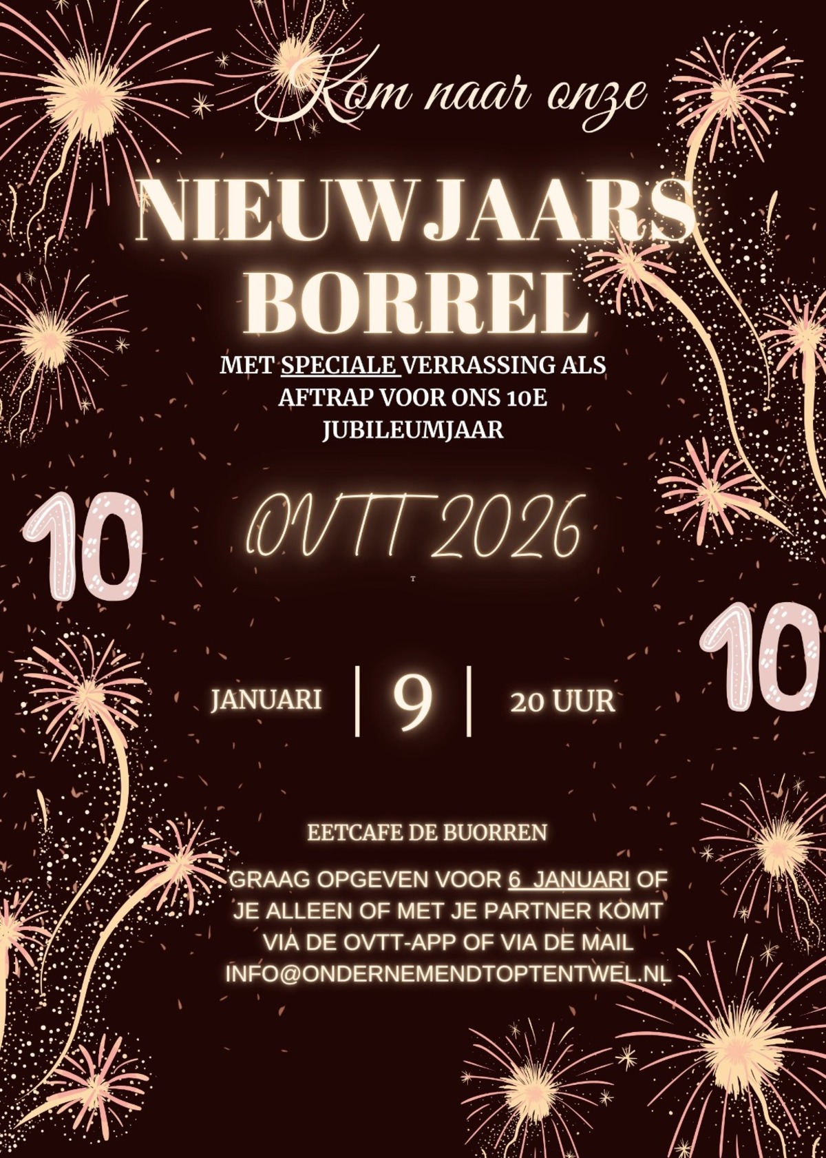 Nieuwjaarsborrel voor ondernemend Top en Twel, de aftrap van het jubileumjaar met speciale verrassing.