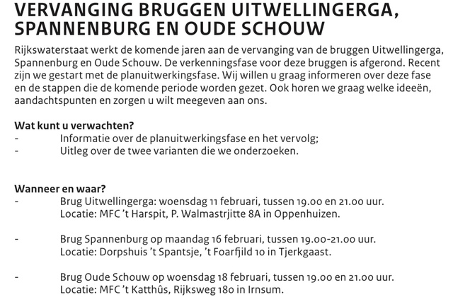 Eind januari vindt een bestuurlijk overleg plaats over de planuitwerkingsfase van de realisatie van de Friese bruggen bij Uitwellingerga, Oude Schouw en Spannenburg. Tijdens dit overleg wordt de uitgangspuntennotitie vastgesteld. In deze notitie zijn de doelstellingen, projectaanpak en uitgangspunten voor het ontwerpen van varianten van een beweegbare brug opgenomen. Ook wordt het proces beschreven om te komen tot een voorkeursvariant.