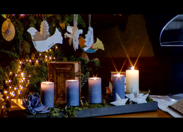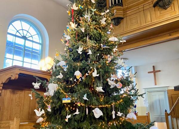 De kerstboom staat weer in de Johanneskerk te pronken. De boom is deze keer prachtig versierd vol met vredesduiven gemaakt door en voor het dorp.