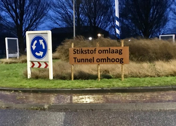 'Stikstof omlaag, Tunnel omhoog'. Passerende automobilisten kunnen het bord op de minirotonde bij Oppenhuizen niet ontgaan, zelfs niet met deze drukte op Nije Dyk tussen Sneek en Joure.