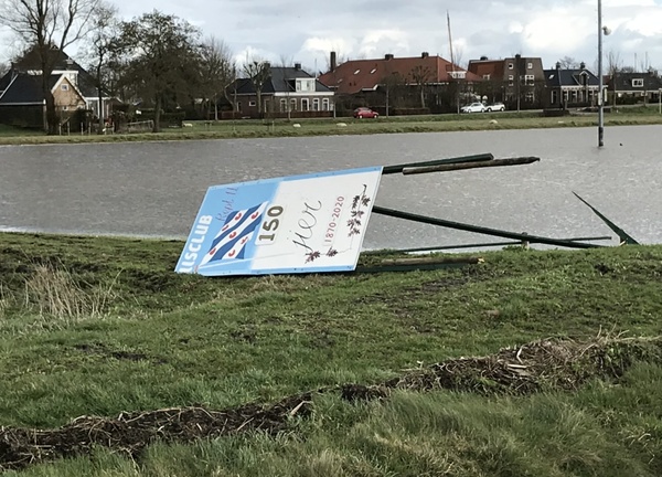 De stoarmeftige wyn en de swiere wynpûsten fan hjoed ha hjir en dêr wer foar de nedige skea soarge. Ek it jubileumboerd fan IIsclub Rept U moast belies jaan yn de hurde wyn.