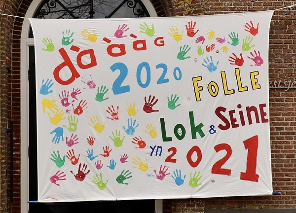 Voor de ingang van de kerk hangt een spandoek met handafdrukken van vele dorpsgenoten. Elkaar de hand schudden is niet mogelijk, dus wordt op deze kleurrijke manier iedereen 'Folle lok en...