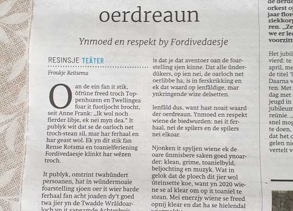 Toanielferiening Fordivedaesje út Top en Twel hat de primeur! It deiboek fan Anne Frank yn it Frysk opfiere yn in (binnen)seal!